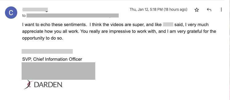 Our client, the CIO of Darden Restaurants, came to Ruca for help with an engaging, informative overview of the 2023 tech roadmap to present at a major internal conference of key stakeholders. Time – in terms of both the production timeline and the available time at the conference – was limited, so we needed to balance a desire to speak to as many features as possible with a need to avoid making things too fast or too dense.